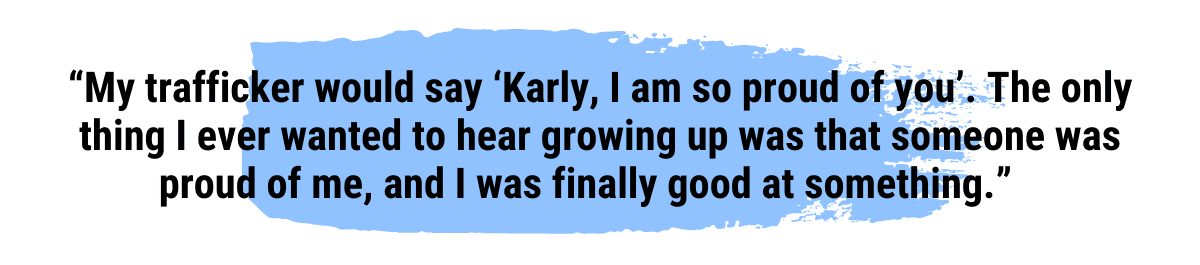 Karly had just arrived in a new city, she was homeless. She had no family or social support system and battled a serious drug addiction. This is when she met her traffickers. “They took the time to get to know me and my needs in a way no one had before,” explains Karly.