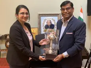 Dr. Hari Kalam showing “The Global Peace Trophy for Dr. APJ Abdul Kalam” to HRH Prince JD before being placed in Dr. Kalam Memorial Rameshwaram, India.