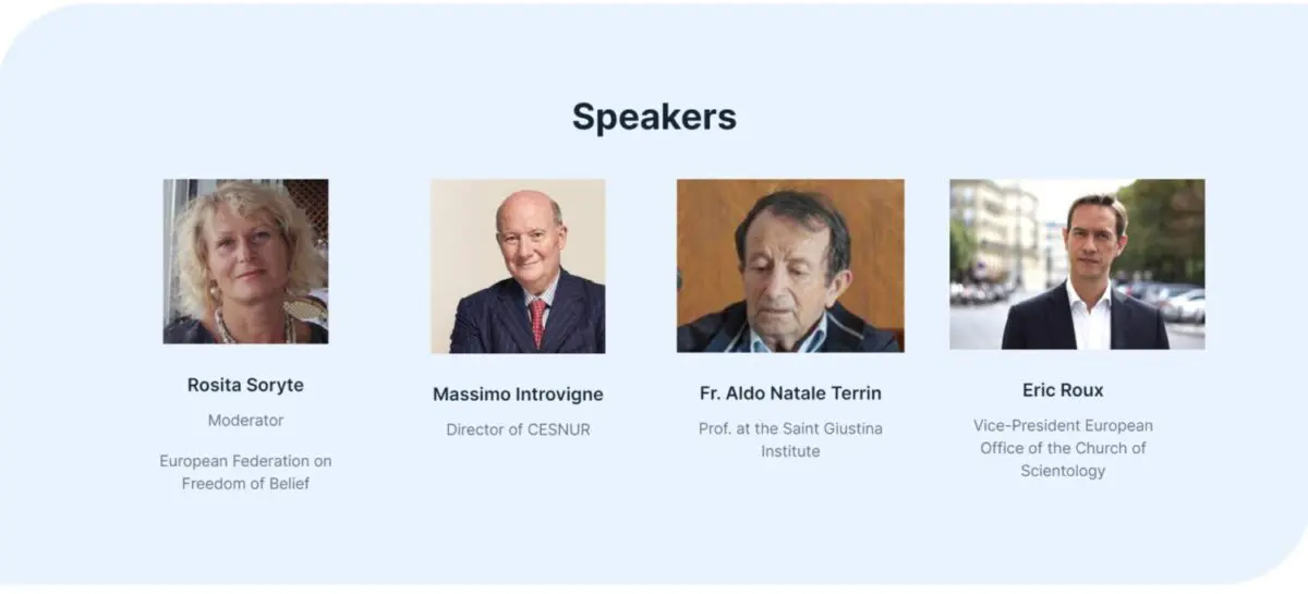 Among the speakers there are Massimo Introvigne, director of the CESNUR, Fr. Aldo Natale Terrin from the Saint Guistina Pontificial Institute, and Eric Roux, Vice-President of the European Office of the Church of Scientology, and will be moderated by Rosita Soryte from the European Federation on Freedom of Belief.