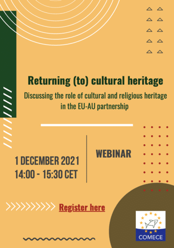 The Commission of the Bishops’ Conferences of the European Union (COMECE) invites you to join the webinar “Returning (to) cultural heritage”, aiming to discuss the role of cultural and religious heritage in the EU-Africa partnership. The event will take place online on Wednesday 1 December 2021 at 14:00 (CET). Click here to register