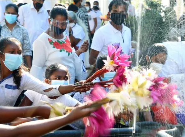 Kelaniya temple: Kids wet their floral offerings at a fountain in Kelaniya temple. Photo: Ajith Perera/ XinhuaDuring his visit, the Buddha delivered sermons to the tribes. After listening to the sermons, the tribes gave up fighting with each other and started to respect each other.