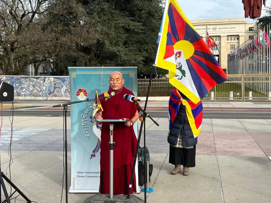 Europe member of the Tibetan Parliament in Exile Ven Thubten Wangchen called for democratic countries to boycott the Beijing Olympic Games while addressing the demonstration in Geneva 04 Jan 2022.