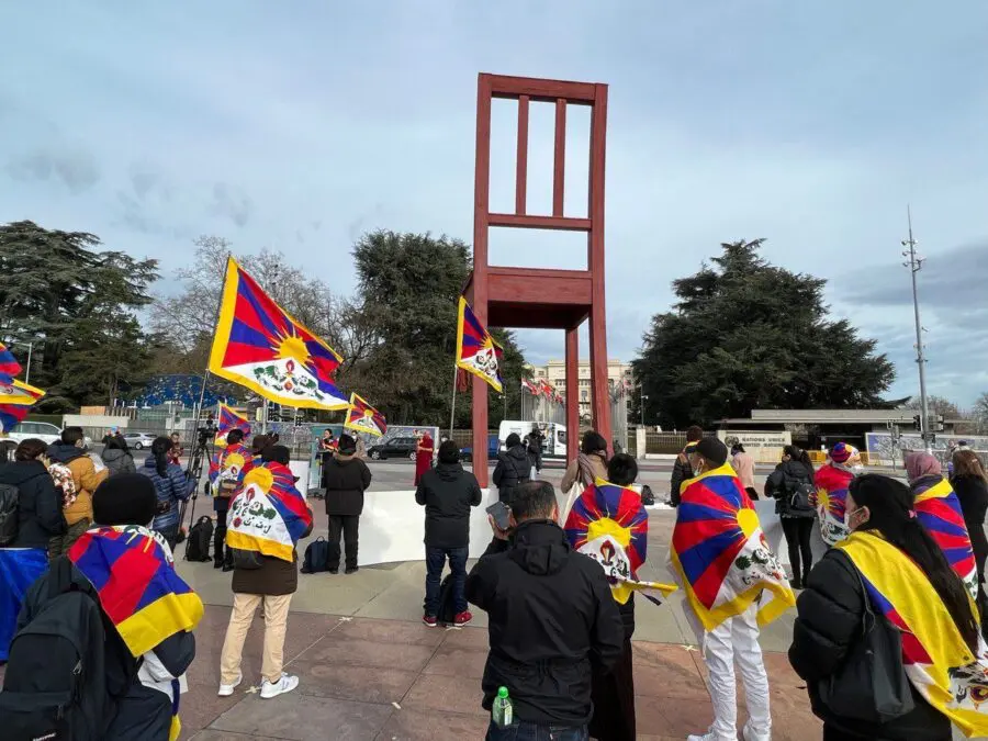 members of the Tibetan community of Switzerland & Liechtenstein gathered in front of the UN Human Rights Council in protest against the winter Olympic games in Beijing.