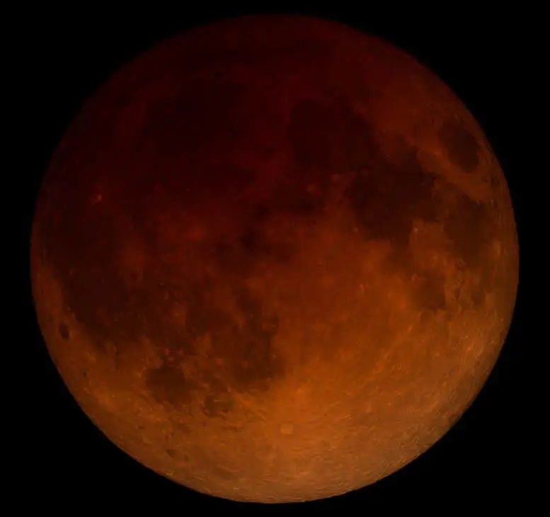It’s no surprise observers coined the ominous-sounding phrase “blood moon,” but the effect is completely natural. During the eclipse, most visible-spectrum light from the Sun is filtered out. Only the red and orange wavelengths reach the surface.
