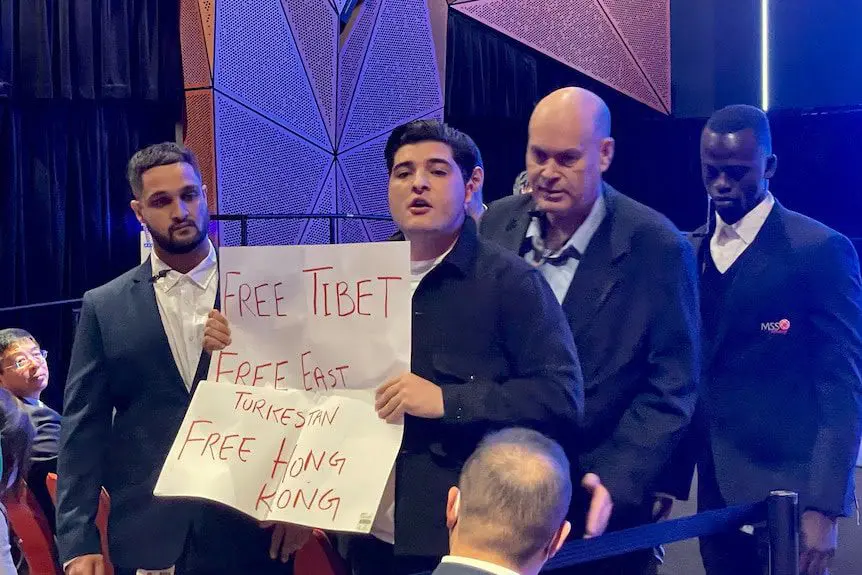 “This is the representative of a dictatorship with one million Muslims in concentration camps. Uyghur Muslims are being raped and tortured as we speak. [It is the same dictatorship] that commits genocide against Tibetans,” vocal Australian activist Drew Pavlou shouted. Another protestor shouted, “This is disgraceful! How about freedom of speech in China?” as he walked out of the room.