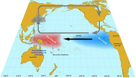 To which is added the Pacific decadal oscillation (PDO), a variation in sea surface temperature over a period of 20 to 30 years, the exact origin of which remains undetermined, and whose effects are similar to those of ENSO
