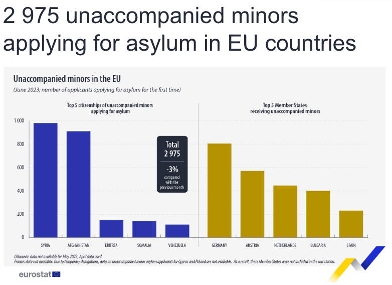 In June 2023, 2,975 unaccompanied minors applied for asylum for the first time in the EU, mostly from Syria (980) and Afghanistan (910). This is according to Eurostat data.