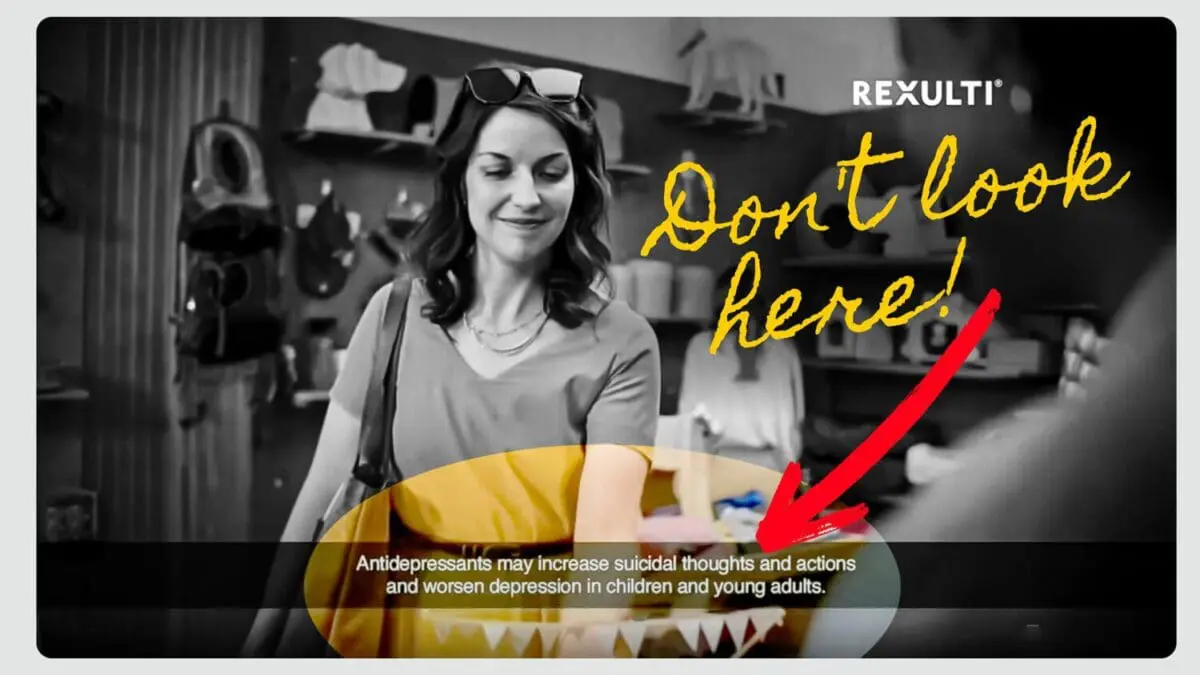 Merrill describes a recent Rexulti commercial as a prime example: while the voiceover warns of side effects like permanent muscle disorders, coma, or death, the screen fills with heartwarming scenes of corgis and family picnics. Such ads, Merrill writes, have historically flouted earlier FDA rules by disguising their warnings in happy imagery.