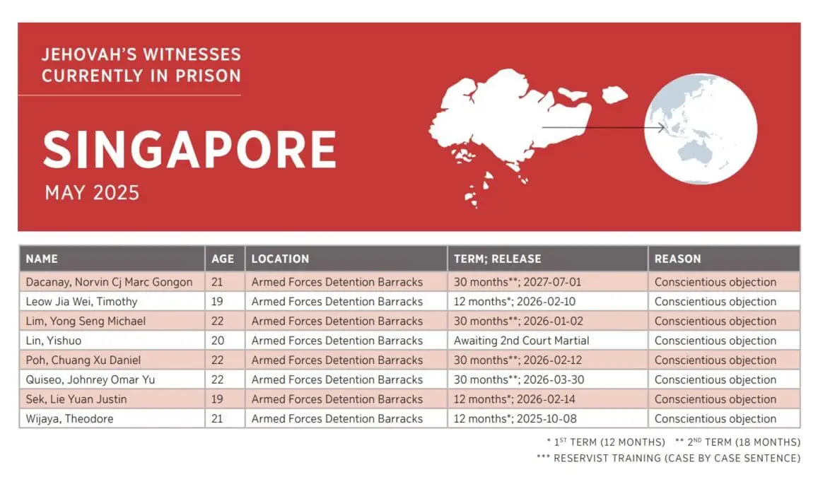 Four of them are serving a second sentence because they refused to change their stance after serving their first prison term. These young men have no legal recourse in Singapore, as the government enforces compulsory military service and does not recognize the right of conscientious objection.