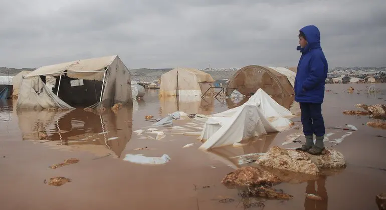 According to the relief coordination office, OCHA, rainfall since Saturday caused widespread flooding across parts of Idleb and northern Latakia, damaging around 1,800 tents and destroying at least 150 in camps housing displaced families.