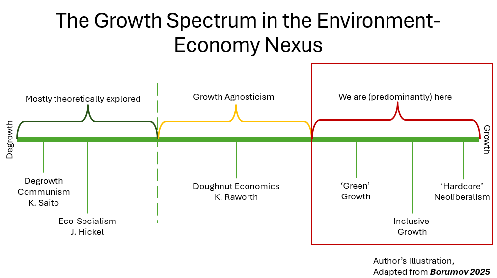 We are, then, left with three approaches to the environment-economy nexus with regard to growth. And yet another question to answer – To grow or not to grow? Theoretically speaking, all of these approaches are logical within their own paradigmatic logic. Then, it could be said that it is a matter of subjective opinion (and to some extent empirical evidence) whether to be loyal to one or another. Yes, there are alternatives to what we know as sustainability today. In other words, there are various ‘sustainabilities’ which consider different things important – growth, human wellbeing, nature’s health. The question in the centre of discussion should be What do we want to be the reason why our economy functions? And the answers may vary depending on whom we ask. Whatever the answers, however, we should be aware that human wellbeing and nature’s health are no less important than economic growth and the sustainment of the economic system we live in. And to acknowledge that, it is worth discussing the theoretical reasonings and practical promises of the non-growth alternatives to problems in the environment-economy nexus. This is what I do in the article to follow.