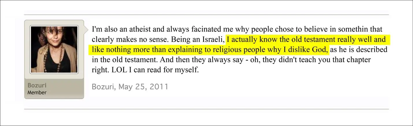 She also boasts about her familiarity with the Old Testament and says she “likes nothing more than explaining to religious people why [she] dislikes God,” a statement that conveys open contempt for believers and shows particular disrespect toward Jews who regard the Hebrew Bible as sacred.